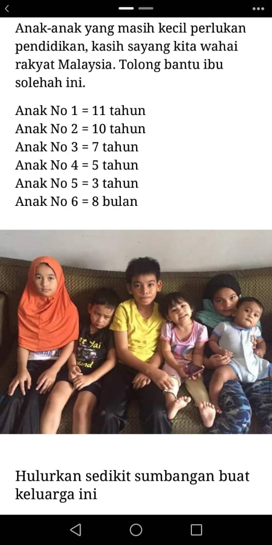 Arwah telah meninggalkan seorang balu dan 6org anak yg masih kecil dr darjah 5 – 7bulan.
